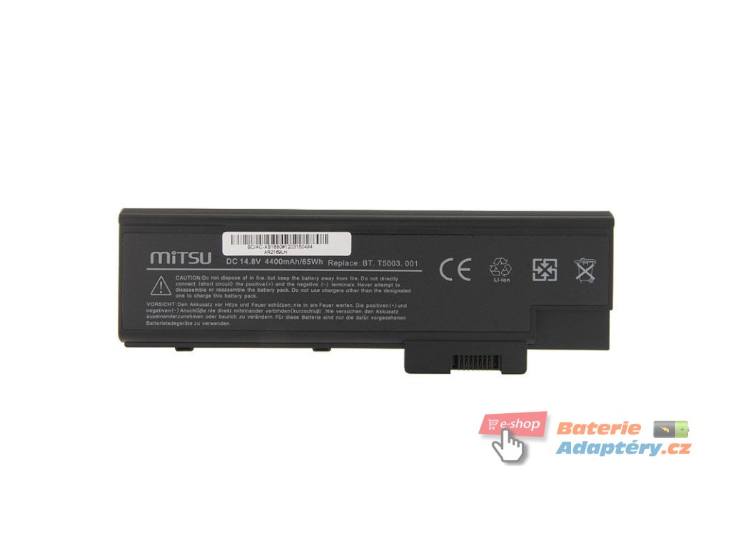 Nová, náhradní baterie značky Mitsu určená pro výbrané typy notebooků Acer. Jedná se o vhodnou alternativu za Váši nefunkční, originální baterii. Baterie Mitsu jsou určeny pro dané typy notebooku a plně nahrazují originálni baterie. Spolehlivost Mitsu Battery dokládají získané certifikáty: CE, FCC, ROHS, které zaručují vysokou kvalitu a mizivou poruchovost. Baterie je vybavená zabezpečením proti hlubokému vybití a přebití. Part. number: BT.T5003.001, LC.BTP03.003, 916-3020, BT.T5005.001, BT.T5005.002, BT.T5007.001, MS2169, SQU-401, 4UR18650F-2-QC140, 4UR18650F-2-QC141, BT.00407.001, BT.00607.001, BT.00804.011, BT.00604.007, 4UR18650F-1-QC192, 916-2990, 916C2990, 916C3020, BT.00403.004, BT.00404.004, BT.00804.014, BT.T5003.002, BT.T5005.000, BT.T5007.002, BTP-03003, BTP-AS1681, CGR-B/423AE, LC.BTP03.010, LIP-4084QUPC, LIP-8198QUPC, MYBAT9007, SY6 Vhodná pro: Acer Aspire 1411, Acer Aspire 1412, Acer Aspire 1413, Acer Aspire 1414, Acer Aspire 1415, Acer Aspire 1640, Acer Aspire 1641, Acer Aspire 1642, Acer Aspire 1650, Acer Aspire 1651, Acer Aspire 1652, Acer Aspire 1654, Acer Aspire 1680, Acer Aspire 1681, Acer Aspire 1682, Acer Aspire 1683, Acer Aspire 1684, Acer Aspire 1685, Acer Aspire 1689, Acer Aspire 1690, Acer Aspire 1691, Acer Aspire 1692, Acer Aspire 1693, Acer Aspire 1694, Acer Aspire 1695, Acer Aspire 1696, Acer Aspire 3000, Acer Aspire 3001, Acer Aspire 3002, Acer Aspire 3003, Acer Aspire 3004, Acer Aspire 3005, Acer Aspire 3500, Acer Aspire 3502, Acer Aspire 3503, Acer Aspire 3505, Acer Aspire 3508, Acer Aspire 3509, Acer Aspire 3510, Acer Aspire 3630, Acer Aspire 5000, Acer Aspire 5001, Acer Aspire 5002, Acer Aspire 5003, Acer Aspire 5004, Acer Aspire 5005, Acer Aspire 5510, Acer Aspire 5512, Acer Aspire 5513, Acer Aspire 5514, Acer Extensa 2300, Acer Extensa 3000, Acer Extensa 4100, Acer Aspire 1411WLMI, Acer Aspire 1412LC, Acer Aspire 1412LCI, Acer Aspire 1412LM, Acer Aspire 1412LMI, Acer Aspire 1412WLMI, Acer Aspire 1413LC, Acer Aspire 1413LM, Acer Aspire 1413LMI, Acer Aspire 1413WLMI, Acer Aspire 1414LC, Acer Aspire 1414LM, Acer Aspire 1414LMI, Acer Aspire 1414WLMI, Acer Aspire 1415LMI, Acer Aspire 1640Z, Acer Aspire 1650Z, Acer Aspire 1680WLCI, Acer Aspire 1680WLMI, Acer Aspire 1681LC, Acer Aspire 1681LCI, Acer Aspire 1681LMI, Acer Aspire 1681WLC, Acer Aspire 1681WLCI, Acer Aspire 1681WLM, Acer Aspire 1681WLMI, Acer Aspire 1682LCI, Acer Aspire 1682LMI, Acer Aspire 1682WLC, Acer Aspire 1682WLM, Acer Aspire 1682WLMI, Acer Aspire 1683LMI, Acer Aspire 1683WLM, Acer Aspire 1683WLMI, Acer Aspire 1684WLMI, Acer Aspire 1685WLCI, Acer Aspire 1685WLMI, Acer Aspire 1689WLMI, Acer Aspire 1690LCI, Acer Aspire 1690LMI, Acer Aspire 1690WLCI, Acer Aspire 1690WLMI, Acer Aspire 1691LCI, Acer Aspire 1691LMI, Acer Aspire 1691WLCI, Acer Aspire 1691WLM, Acer Aspire 1691WLMI, Acer Aspire 1692LMI, Acer Aspire 1692WLCI, Acer Aspire 1692WLMI, Acer Aspire 1693WLCI, Acer Aspire 1693WLM, Acer Aspire 1693WLMI, Acer Aspire 1694LMI, Acer Aspire 1694WLCI, Acer Aspire 1694WLMI, Acer Aspire 1695WLMI, Acer Aspire 3000LC, Acer Aspire 3000LCI, Acer Aspire 3000LM, Acer Aspire 3000LMI, Acer Aspire 3000WLMI, Acer Aspire 3001LC, Acer Aspire 3001WLCI, Acer Aspire 3001WLMI, Acer Aspire 3002LC, Acer Aspire 3002LCI, Acer Aspire 3002LMI, Acer Aspire 3002NLC, Acer Aspire 3002NLCI, Acer Aspire 3002NWLCI, Acer Aspire 3002WLCI, Acer Aspire 3002WLMI, Acer Aspire 3003LC, Acer Aspire 3003LCI, Acer Aspire 3003LMI, Acer Aspire 3003WLCI, Acer Aspire 3003WLMI, Acer Aspire 3004WLMI, Acer Aspire 3005LCI, Acer Aspire 3005WLMI, Acer Aspire 3502LC, Acer Aspire 3502LCI, Acer Aspire 3502LMI, Acer Aspire 3502NLCI, Acer Aspire 3502WLC, Acer Aspire 3502WLCI, Acer Aspire 3502WLMI, Acer Aspire 3503NWLM, Acer Aspire 3503WLCI, Acer Aspire 3503WLMI, Acer Aspire 3505LMI, Acer Aspire 3505WLMI, Acer Aspire 3508WLMI, Acer Aspire 3509WLMI, Acer Aspire 5000WLMI, Acer Aspire 5001LCI, Acer Aspire 5001LM, Acer Aspire 5001LMI, Acer Aspire 5001WLCI, Acer Aspire 5001WLMI, Acer Aspire 5002LC, Acer Aspire 5002LCI, Acer Aspire 5002LM, Acer Aspire 5002LMI, Acer Aspire 5002NWLMI, Acer Aspire 5002WLCI, Acer Aspire 5002WLM, Acer Aspire 5002WLMI, Acer Aspire 5003WLCI, Acer Aspire 5003WLMI, Acer Aspire 5004WLCI, Acer Aspire 5004WLMI, Acer Aspire 5005WLMI, Acer Aspire 5512WLM, Acer Aspire 5513EWLM, Acer Aspire 5513EWLMI, Acer Aspire 5513WLMI, Acer Aspire 5514WLMI, Acer Extensa 4010, Acer Aspire 1414L, Acer Aspire 1414WLCI, Acer Aspire 1640LC, Acer Aspire 1641LM, Acer Aspire 1641LMI, Acer Aspire 1641WLMI, Acer Aspire 1642WLMI, Acer Aspire 1651NWLCI, Acer Aspire 1651WLCI, Acer Aspire 1651WLMI, Acer Aspire 1652WLMI, Acer Aspire 1654WLMI, Acer Aspire 1682WLCI, Acer Aspire 1690-II, Acer Aspire 1692WCLI, Acer Aspire 1696WLMI, Acer Aspire 3002NWLC, Acer Aspire 3002WLC, Acer Aspire 3003NLMI, Acer Aspire 3003WLM, Acer Aspire 3500WLCI, Acer Aspire 3500WLMI, Acer Aspire 3503NWLMI, Acer Aspire 3509WLMJI, Acer Aspire 5512WLMI, Acer Extensa 2301, Acer Extensa 2301WLMI, Acer Extensa 2303, Acer Extensa 2303LC, Acer Extensa 2303LCI, Acer Extensa 2303LM, Acer Extensa 2303LMI, Acer Extensa 2303WLM, Acer Extensa 2303WLMI, Acer Extensa 2304, Acer Extensa 2304WLM, Acer Extensa 2304WLMI, Acer Extensa 2308, Acer Extensa 2308LCI, Acer Extensa 2308NCLI, Acer Extensa 3000WLM, Acer Extensa 3000WLMI, Acer Extensa 3001, Acer Extensa 3001LMI, Acer Extensa 3001WLM, Acer Extensa 3001WLMI, Acer Extensa 3002, Acer Extensa 3002LMI, Acer Extensa 3002WLM, Acer Extensa 3002WLMI, Acer Extensa 3003, Acer Extensa 3003WLM, Acer Extensa 3003WLMI, Acer Extensa 4100WLMI, Acer Extensa 4101, Acer Extensa 4101WLM, Acer Extensa 4101WLMI, Acer Extensa 4102, Acer Extensa 4102WLM, Acer Extensa 4102WLMI, Acer Extensa 4104, Acer Extensa 4104WLM, Acer Extensa 4104WLMI, Acer Extensa 6600, Acer Extensa 6700Doplňkové parametry