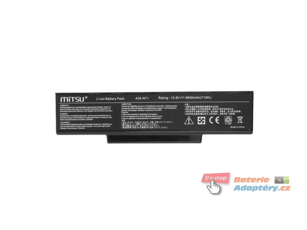 Nová, náhradní baterie značky Mitsu určená pro vybrané typy notebooků Asus. Jedná se o vhodnou alternativu za Váši nefunkční, originální baterii. Baterie Mitsu jsou určeny pro dané typy notebooku a plně nahrazují originální baterie. Spolehlivost Mitsu Battery dokládají získané certifikáty: CE, FCC, ROHS, které zaručují vysokou kvalitu a mizivou poruchovost. Baterie je vybavená zabezpečením proti hlubokému vybití a přebití. Part. number: A32-K72, A32-N71, 90-XB2KN0BT00000Y, 70-NX01B1000Z, 70-NZY1B1000Z, 70-NZYB1000Z, 70-NXH1B1000Z Vhodná pro: Asus X72, Asus X72D, Asus X72V, Asus X72VM, Asus X72VR, Asus A72, Asus A72D, Asus A72F, Asus A72J, Asus A72JK, Asus A72JR, Asus K72, Asus K72D, Asus K72DR, Asus K72F, Asus K72J, Asus K72JK, Asus K72JR, Asus K72JT, Asus K72JU, Asus K73, Asus K73E, Asus K73S, Asus K73SV, Asus N71, Asus N71JA, Asus N71JQ, Asus N71JV, Asus N71VG, Asus N71VN, Asus N73, Asus N73JF, Asus N73JN, Asus N73JQ, Asus N73SV, Asus X77, Asus X77JQ, Asus X77VN, Asus X7AJT, Asus X7BJG, Asus X7BSV, Asus A72DR, Asus A73BR, Asus A73BY, Asus A73E, Asus A73SD, Asus A73SJ, Asus A73SM, Asus A73SV, Asus A73TA, Asus A73TK, Asus K72DY, Asus K72JB, Asus K73BR, Asus K73BY, Asus K73SD, Asus K73SJ, Asus K73SM, Asus K73TA, Asus K73TK, Asus N73JG, Asus N73SM, Asus PRO7ADR, Asus PRO7AF, Asus PRO7AJK, Asus PRO7AJR, Asus PRO7AJT, Asus PRO7AJU, Asus PRO7BJF, Asus PRO7BJG, Asus PRO7BJQ, Asus PRO7BSM, Asus PRO7BSV, Asus PRO7CBR, Asus PRO7CBY, Asus PRO7CE, Asus PRO7CSD, Asus PRO7CSJ, Asus PRO7CSM, Asus PRO7CSV, Asus PRO7CTA, Asus PRO7CTK, Asus X72DR, Asus X72DY, Asus X72F, Asus X72JK, Asus X72JR, Asus X72JT, Asus X72JU, Asus X72SA, Asus X72SR, Asus X72TL, Asus X72VN, Asus X73BR, Asus X73BY, Asus X73E, Asus X73SD, Asus X73SI, Asus X73SJ, Asus X73SM, Asus X73SV, Asus X73TA, Asus X73TK, Asus X77JA, Asus X77JV, Asus X77VG, Asus X7ADR, Asus X7ADY, Asus X7AF, Asus X7AJK, Asus X7AJR, Asus X7AJU, Asus X7BJF, Asus X7BJN, Asus X7BJQ, Asus X7BSM, Asus X7CBR, Asus X7CBY, Asus X7CE, Asus X7CSD, Asus X7CSJ, Asus X7CSM, Asus X7CSV, Asus X7CTA, Asus X7CTK, Asus A73, Asus K72JA, Asus K72JC, Asus K72JE, Asus K72JF, Asus K72JH, Asus K72JL, Asus K72JM, Asus K72JO, Asus K72JQ, Asus K72JV, Asus K72JW, Asus K72K, Asus K72L, Asus K72N, Asus K72P, Asus K72Q, Asus K72R, Asus K72S, Asus K72Y, Asus K73B, Asus K73J, Asus K73JK, Asus K73T, Asus N71J, Asus N71V, Asus N71YI, Asus N73F, Asus N73G, Asus N73J, Asus N73Q, Asus N73S, Asus N73SD, Asus N73SL, Asus N73SN, Asus N73SQ, Asus N73SW, Asus N73V, Asus N73Y, Asus N73YI, Asus PRO7A, Asus PRO7AD, Asus PRO7ADY, Asus PRO7AJ, Asus PRO7B, Asus PRO7BJ, Asus PRO7BS, Asus PRO7C, Asus PRO7CB, Asus PRO7CS, Asus PRO7CT, Asus X72J, Asus X72S, Asus X72T, Asus X73, Asus X73B, Asus X73S, Asus X73T, Asus X77J, Asus X77JG, Asus X77JO, Asus X77V, Asus X7A, Asus X7AD, Asus X7AJ, Asus X7B, Asus X7BJ, Asus X7BS, Asus X7BSN, Asus X7C, Asus X7CB, Asus X7CS, Asus X7CTDoplňkové parametry