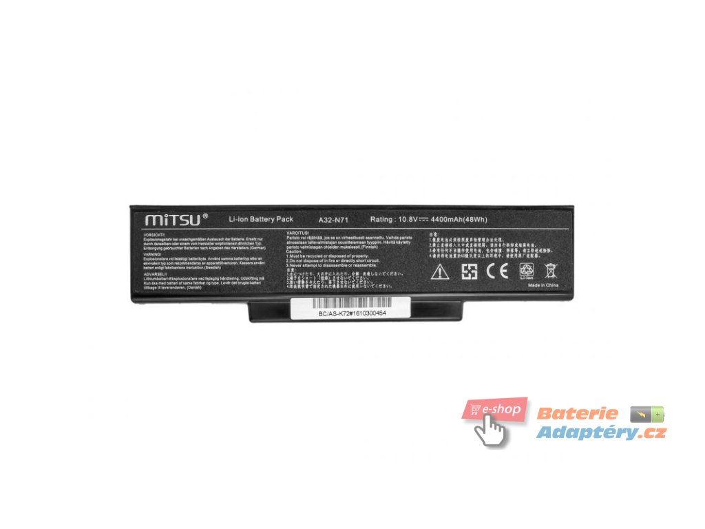 Nová, náhradní baterie značky Mitsu určená pro výbrané typy notebooků Asus. Jedná se o vhodnou alternativu za Váši nefunkční, originální baterii. Baterie Mitsu jsou určeny pro dané typy notebooku a plně nahrazují originálni baterie. Spolehlivost Mitsu Battery dokládají získané certifikáty: CE, FCC, ROHS, které zaručují vysokou kvalitu a mizivou poruchovost. Baterie je vybavená zabezpečením proti hlubokému vybití a přebití. Part. number: A32-K72, A32-N71, 90-XB2KN0BT00000Y, 70-NX01B1000Z, 70-NZY1B1000Z, 70-NZYB1000Z, 70-NXH1B1000Z Vhodná pro: Asus X72, Asus X72D, Asus X72V, Asus X72VM, Asus X72VR, Asus A72, Asus A72D, Asus A72F, Asus A72J, Asus A72JK, Asus A72JR, Asus K72, Asus K72D, Asus K72DR, Asus K72F, Asus K72J, Asus K72JK, Asus K72JR, Asus K72JT, Asus K72JU, Asus K73, Asus K73E, Asus K73S, Asus K73SV, Asus N71, Asus N71JA, Asus N71JQ, Asus N71JV, Asus N71VG, Asus N71VN, Asus N73, Asus N73JF, Asus N73JN, Asus N73JQ, Asus N73SV, Asus X77, Asus X77JQ, Asus X77VN, Asus X7AJT, Asus X7BJG, Asus X7BSV, Asus A72DR, Asus A73BR, Asus A73BY, Asus A73E, Asus A73SD, Asus A73SJ, Asus A73SM, Asus A73SV, Asus A73TA, Asus A73TK, Asus K72DY, Asus K72JB, Asus K73BR, Asus K73BY, Asus K73SD, Asus K73SJ, Asus K73SM, Asus K73TA, Asus K73TK, Asus N73JG, Asus N73SM, Asus PRO7ADR, Asus PRO7AF, Asus PRO7AJK, Asus PRO7AJR, Asus PRO7AJT, Asus PRO7AJU, Asus PRO7BJF, Asus PRO7BJG, Asus PRO7BJQ, Asus PRO7BSM, Asus PRO7BSV, Asus PRO7CBR, Asus PRO7CBY, Asus PRO7CE, Asus PRO7CSD, Asus PRO7CSJ, Asus PRO7CSM, Asus PRO7CSV, Asus PRO7CTA, Asus PRO7CTK, Asus X72DR, Asus X72DY, Asus X72F, Asus X72JK, Asus X72JR, Asus X72JT, Asus X72JU, Asus X72SA, Asus X72SR, Asus X72TL, Asus X72VN, Asus X73BR, Asus X73BY, Asus X73E, Asus X73SD, Asus X73SI, Asus X73SJ, Asus X73SM, Asus X73SV, Asus X73TA, Asus X73TK, Asus X77JA, Asus X77JV, Asus X77VG, Asus X7ADR, Asus X7ADY, Asus X7AF, Asus X7AJK, Asus X7AJR, Asus X7AJU, Asus X7BJF, Asus X7BJN, Asus X7BJQ, Asus X7BSM, Asus X7CBR, Asus X7CBY, Asus X7CE, Asus X7CSD, Asus X7CSJ, Asus X7CSM, Asus X7CSV, Asus X7CTA, Asus X7CTK, Asus A73, Asus K72JA, Asus K72JC, Asus K72JE, Asus K72JF, Asus K72JH, Asus K72JL, Asus K72JM, Asus K72JO, Asus K72JQ, Asus K72JV, Asus K72JW, Asus K72K, Asus K72L, Asus K72N, Asus K72P, Asus K72Q, Asus K72R, Asus K72S, Asus K72Y, Asus K73B, Asus K73J, Asus K73JK, Asus K73T, Asus N71J, Asus N71V, Asus N71YI, Asus N73F, Asus N73G, Asus N73J, Asus N73Q, Asus N73S, Asus N73SD, Asus N73SL, Asus N73SN, Asus N73SQ, Asus N73SW, Asus N73V, Asus N73Y, Asus N73YI, Asus PRO7A, Asus PRO7AD, Asus PRO7ADY, Asus PRO7AJ, Asus PRO7B, Asus PRO7BJ, Asus PRO7BS, Asus PRO7C, Asus PRO7CB, Asus PRO7CS, Asus PRO7CT, Asus X72J, Asus X72S, Asus X72T, Asus X73, Asus X73B, Asus X73S, Asus X73T, Asus X77J, Asus X77JG, Asus X77JO, Asus X77V, Asus X7A, Asus X7AD, Asus X7AJ, Asus X7B, Asus X7BJ, Asus X7BS, Asus X7BSN, Asus X7C, Asus X7CB, Asus X7CS, Asus X7CTDoplňkové parametry