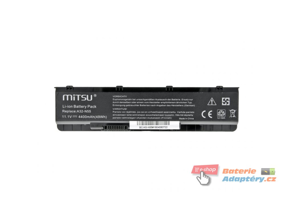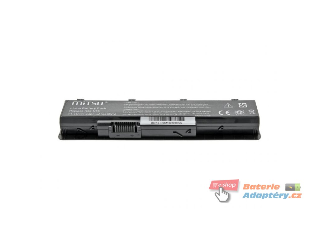 Nová, náhradní baterie značky Mitsu určená pro výbrané typy notebooků Asus. Jedná se o vhodnou alternativu za Váši nefunkční, originální baterii. Baterie Mitsu jsou určeny pro dané typy notebooku a plně nahrazují originálni baterie. Spolehlivost Mitsu Battery dokládají získané certifikáty: CE, FCC, ROHS, které zaručují vysokou kvalitu a mizivou poruchovost. Baterie je vybavená zabezpečením proti hlubokému vybití a přebití. Part. number: 07G016HY1875, A31-N55, A32-N45, A32-N55 Vhodná pro: Asus N45SF, Asus N45SL, Asus N55SF, Asus N55SL, Asus N75SF, Asus N75SL, Asus N45, Asus N45E, Asus N45S, Asus N55, Asus N55E, Asus N55S, Asus N75, Asus N75E, Asus N75N, Asus N75S, Asus N75SJ, Asus N75SN, Asus N75SV, Asus N75V, Asus D778Doplňkové parametry