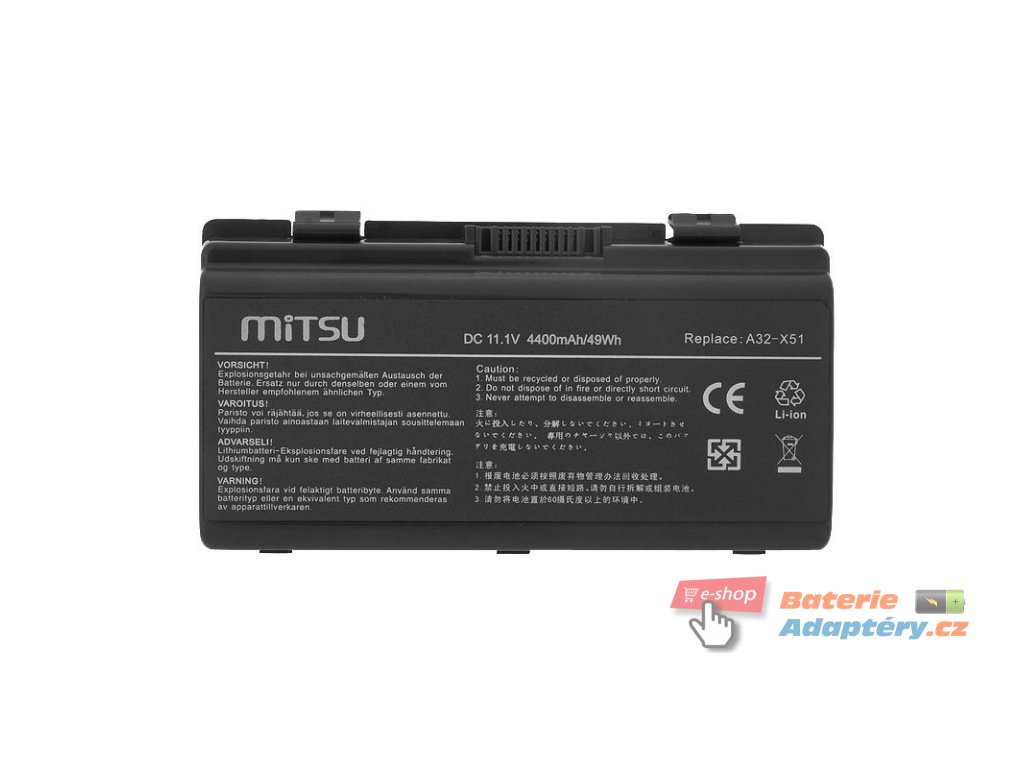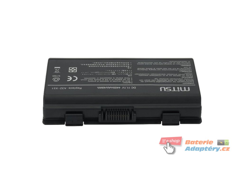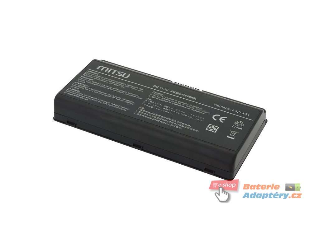 Nová, náhradní baterie značky Mitsu určená pro výbrané typy notebooků Asus. Jedná se o vhodnou alternativu za Váši nefunkční, originální baterii. Baterie Mitsu jsou určeny pro dané typy notebooku a plně nahrazují originálni baterie. Spolehlivost Mitsu Battery dokládají získané certifikáty: CE, FCC, ROHS, které zaručují vysokou kvalitu a mizivou poruchovost. Baterie je vybavená zabezpečením proti hlubokému vybití a přebití. Part. number: A32-X51, 90-NQK1B1000Y, A32-T12, 7414750000, 7430020000, 7432520000, 90R-NQL1B1000Y, A31-T12, A31-X51, A31-X58, A32-MX90, A32-T12J, A32-XT12, CBI2095A Vhodná pro: Asus T12, Asus T12C, Asus T12Er, Asus T12Fg, Asus T12Jg, Asus T12Mg, Asus T12Ug, Asus X51, Asus X51C, Asus X51H, Asus X51L, Asus X51R, Asus X51RL, Asus X58, Asus X58C, Asus X58L, Asus Pro52RL, Asus X58LE, Asus PRO52H, Asus PRO52L, Asus T12EG, Asus T12KG, Packard Bell EasyNote MX52, Asus PRO52, Asus PRO52R, Asus PRO52SN, Asus T12B, Asus T12E, Asus T12F, Asus T12J, Asus T12K, Asus T12M, Asus T12RG, Asus T12U, Asus X51Q, Asus X5L, Asus X5LD, Asus X5LJ, Medion Akoya P5510, Packard Bell Easy Note MX35, Packard Bell Easy Note MX36, Packard Bell Easy Note MX37, Packard Bell Easy Note MX45, Packard Bell Easy Note MX51, Packard Bell Easy Note MX52, Packard Bell Easy Note MX65, Packard Bell Easy Note MX66, Packard Bell EasyNote MX35, Packard Bell EasyNote MX36, Packard Bell EasyNote MX37, Packard Bell EasyNote MX45, Packard Bell EasyNote MX51, Packard Bell EasyNote MX61, Packard Bell EasyNote MX65, Packard Bell EasyNote MX66, Packard Bell EasyNote MX67Doplňkové parametry