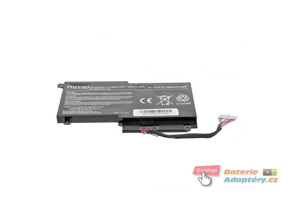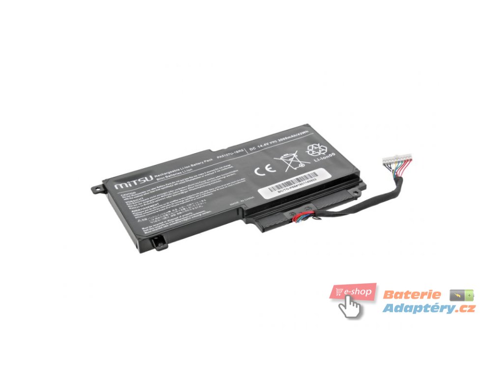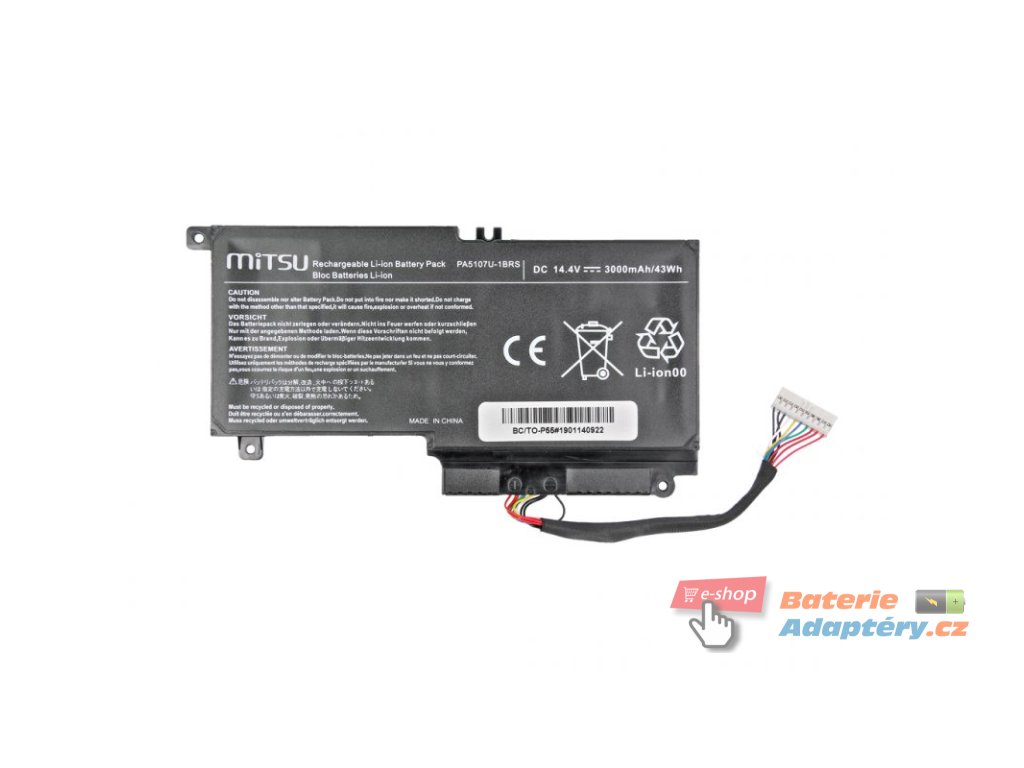 Nová, náhradní baterie značky Mitsu určená pro vybrané typy notebooků Toshiba. Jedná se o vhodnou alternativu za Váši nefunkční, originální baterii. Baterie Mitsu jsou určeny pro dané typy notebooku a plně nahrazují originální baterie. Spolehlivost Mitsu Battery dokládají získané certifikáty: CE, FCC, ROHS, které zaručují vysokou kvalitu a mizivou poruchovost. Baterie je vybavená zabezpečením proti hlubokému vybití a přebití. Part. number: 4ICP9/39/65-1, PA5107U-1BRS, PA5107-1BRS Vhodná pro: Toshiba Satellite L50, Toshiba Satellite L50-A, Toshiba Satellite L50-A-1D6, Toshiba Satellite L50-ABT2N22, Toshiba Satellite L50-AST2NX1, Toshiba Satellite L50-AST2NX2, Toshiba Satellite L50-AST2NX3, Toshiba Satellite L50D-A, Toshiba Satellite L50D-ABT2N22, Toshiba Satellite L50D-AST2NX1, Toshiba Satellite L50DT-A, Toshiba Satellite L55, Toshiba Satellite L55-A5226, Toshiba Satellite L55-A5234, Toshiba Satellite L55-A5278, Toshiba Satellite L55-A5284, Toshiba Satellite L55-A5284NR, Toshiba Satellite L55-A5299, Toshiba Satellite L55DT-A5253, Toshiba Satellite L55DT-A5254, Toshiba Satellite L55DT-A5293, Toshiba Satellite L55T, Toshiba Satellite P50, Toshiba Satellite P50-A, Toshiba Satellite P50-ABT2G22, Toshiba Satellite P50-ABT2N22, Toshiba Satellite P50-AST2GX1, Toshiba Satellite P50-AST2NX1, Toshiba Satellite P50-AST2NX2, Toshiba Satellite P50-B, Toshiba Satellite P50D-A, Toshiba Satellite P50DT-A, Toshiba Satellite P50T-A, Toshiba Satellite P50T-A01C, Toshiba Satellite P50T-B, Toshiba Satellite P55, Toshiba Satellite P55-A5200, Toshiba Satellite P55-A53, Toshiba Satellite P55-A5312, Toshiba Satellite P55T, Toshiba Satellite P55T-A5202, Toshiba Satellite S50-A, Toshiba Satellite S50-A-113, Toshiba Satellite S50-A-115, Toshiba Satellite S50-A-K1M, Toshiba Satellite S50-A-K7M, Toshiba Satellite S50-A-X0010, Toshiba Satellite S50-ABT2N22, Toshiba Satellite S50-AST2NX1, Toshiba Satellite S50-AST2NX2, Toshiba Satellite S50-AST3NX1, Toshiba Satellite S50D-A, Toshiba Satellite S50DT-A, Toshiba Satellite S50T-A, Toshiba Satellite S55, Toshiba Satellite S55-A, Toshiba Satellite S55-A5275, Toshiba Satellite S55-A5279, Toshiba Satellite S55-A5294, Toshiba Satellite S55-A5295, Toshiba Satellite S55T, Toshiba Satellite S55T-A, Toshiba Satellite S55T-A5258NR, Toshiba Satellite S55T-A5379, Toshiba Satellite Pro L50-A, Toshiba Satellite Pro L50D-A, Toshiba Satellite Pro L50DT-A, Toshiba Satellite Pro L50T-ADoplňkové parametry